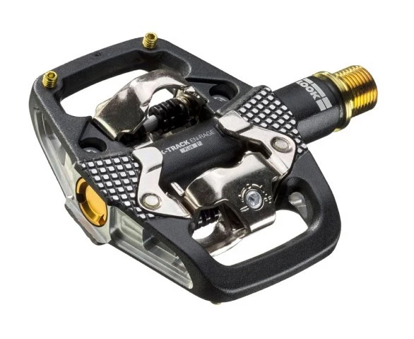 Look X-Track En-Rage jsou odolné nášlapné pedály určené na trailová a enduro kola. Jsou vybaveny robustní vnější klecí, která chrání mechanismus před nárazy kamenů. Díky velké kontaktní ploše a pinům v předním části poskytují maximální stabilitu a efektivní přenos energie, zatímco otevřená konstrukce zajišťuje spolehlivou funkci i v blátě či písku. Výhodou pedálů Look X-Track je kompatibilita se zarážkami Shimano SPD.