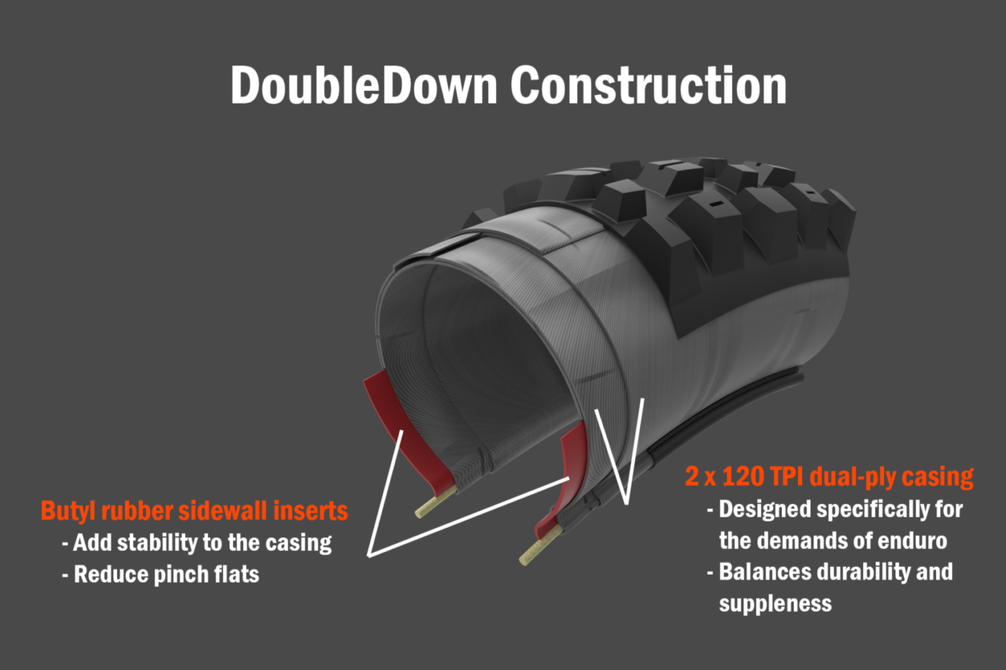 DoubleDown (DD) - ochrana pláště tvořená dvěma vrstvami tkaniny s hustotou 120 TPI a butylovou výztuhou u patky. Takto vybavené pláště poskytují odolnost srovnatelnou s DH plášti v lehčím provedení, ideální volba na enduro kola e-biky.