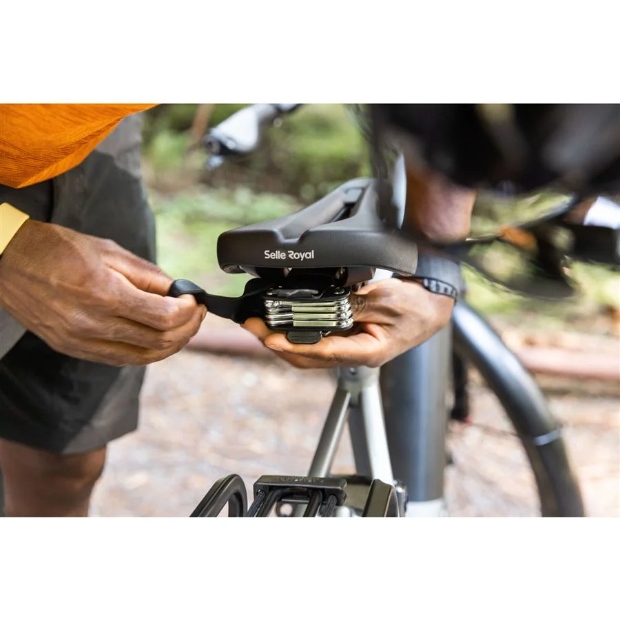 Buďte vždy připraveni na nečekané situace. Kompaktní 9funkční multifunkční nářadí se upevňuje na zadní část sedla vybaveného systémem ICS a je vždy po ruce pro rychlé úpravy a opravy na cestách. Nářadí je chráněno odolným pryžovým pouzdrem proti nárazům.