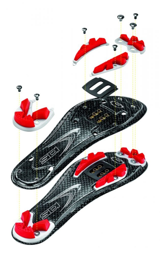 Profesionální závodní tretry s karbonovou podrážkou, unikátním patentovaným systémem zapínání Tecno 3 a nasatvitelnou patou. Vyměnitelný systém podrážky Sidi SRS. Celý popis